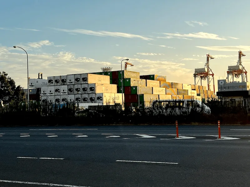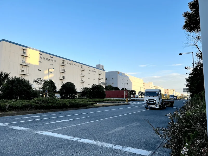そのあとは、ひたすら端の方を目指して歩いた。 デカい倉庫的な建物が並び、道路には荷物を運ぶトラックだけが行き来している。 少し遠くに目を向けると海、コンテナ、コンテナ、クレーン、コンテナ……。 自分の日常からはかけ離れた風景で、わくわくしてきた。