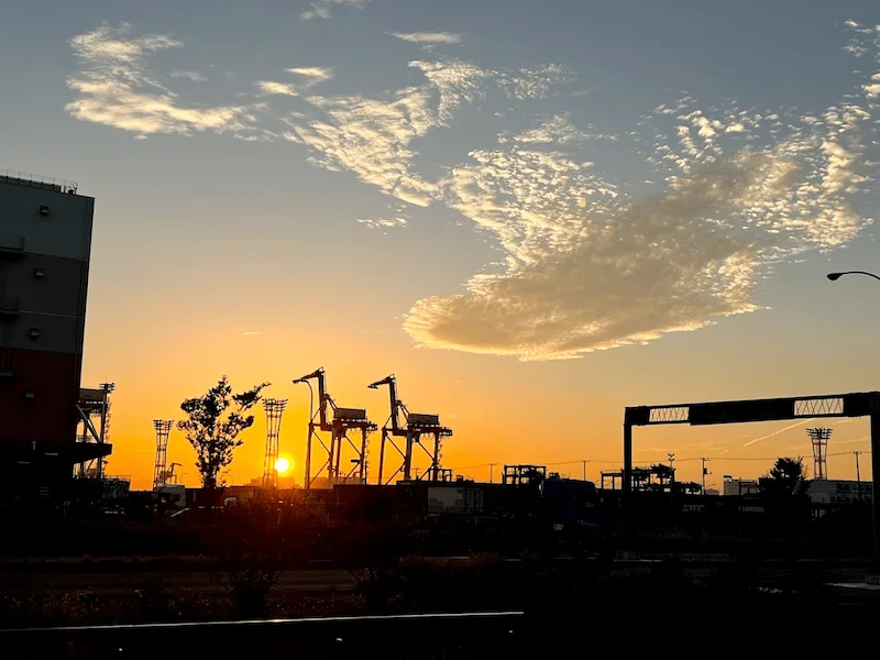 公園でしばらく海を眺め、さて、端を見るという実績は解除したので帰るかと来た道を戻っていった。 帰り際にふと上の方を見ると、コンテナやクレーンがなんだか幻想的に見える。 ちょうど夕暮れの時間帯で、あかね色に染まる空と影のように映るクレーンが妙にマッチしていた。 青海コンテナ埠頭のクレーンは動物のキリンのような形で、まるでサバンナの夕暮れ時を模したようで味わい深かった。