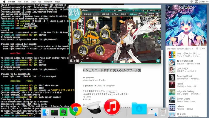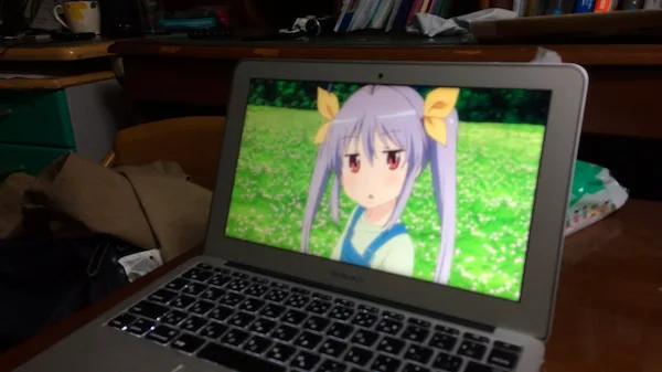 スマホの話題はこれぐらいにして、大学生になってからはお金を稼げるようになったので、Mac(Macbook Air)を購入した。 OS XのAquaに惹かれてからここまで長かった。Macbook Airを注文して届くまでの数日は毎日帰り道でMacを手に入れた時のことを妄想し続けていた。 届いた日には徹夜でMacの環境を整備した。綺麗にアンチエイリアシングされたフォントを見るだけで心躍った。 この年は深夜アニメとソーシャルゲームに本格入門した年でもあったため、Appleの洗練されたUIに”あえて”萌えアニメを組み合わせることこそがクールだと、そう信じていた、いや、今でも信じてる。