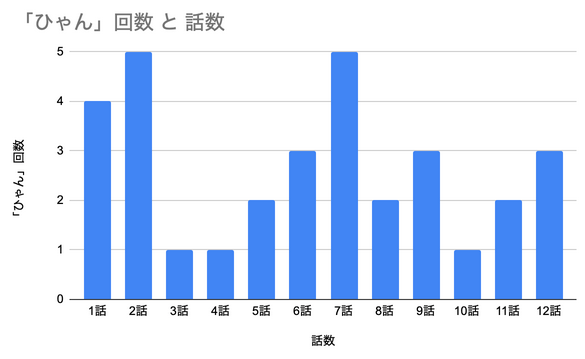 この「ひゃん」がかなり興味深かったのでエピソードごとに回数をカウントしてみた。 なんとすべての話に1回以上の「ひゃん」が確認された。平均すると約 2.7hpe(hyans per episode)である。