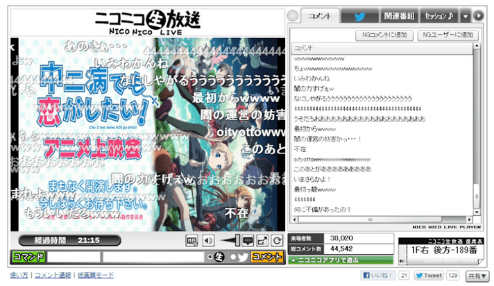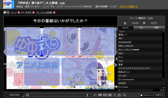 昔からニコニコ動画でMADを見るのはよくやっていたのだが、アニメの公式生放送を見るのは初めてだった。 毎週特定の時間になると生放送のゲートが開いて、会場に入れる。そこには他の視聴者たちのコメントがリアルタイムで流れてくる。 そしてみんなでコメントを入れながらアニメを見る。という単純な仕組みである。