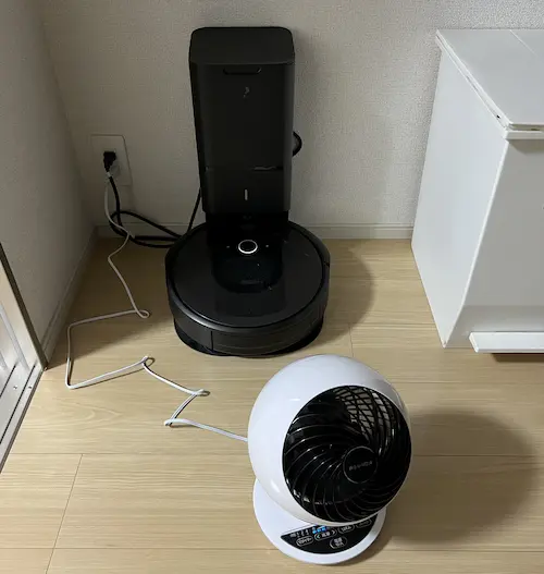 上の写真のように電源が取れる場所の近くに置くとロボット掃除機の近くになってしまって、掃除をかけるときだけサーキュレーターを持ち上げて別の場所にどかしておく必要がありこれがちょっと面倒でどうしようかなと悩み中。