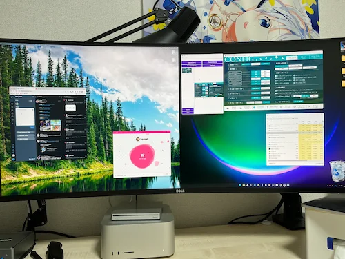 このように複数PCを横半分ずつ表示できて確かにすごいのだが、結果としてあまり使っていない。 まず通常モードとPBPを切り替えるとOS的には画面解像度の変更となり安定するまで〜10秒ほどかかる上にウィンドウの配置がぐちゃぐちゃになるのであまり気軽にON/OFFできる感じではない。強みのUSBハブ機能も、PBP中はどちらか片方のみにしか認識しないため微妙。 そして2つのPCで同時に作業すること自体が最近はあまりなく、メインのMacで大抵事足りるというのもある。
