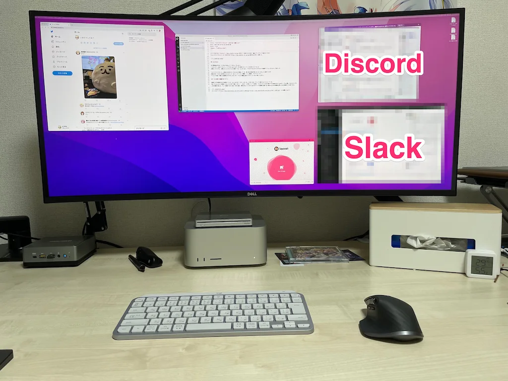 まず解像度が5K2K (5120x2160px)で、めちゃくちゃ広い。 このモニターに変えてからウィンドウを(Cmd+Tabで)切り替えるということをほぼしなくなった。 左側にブラウザを、右側にDiscordとSlackを置いてる。とにかく広い、それだけで結構テンションも上がって良かった。