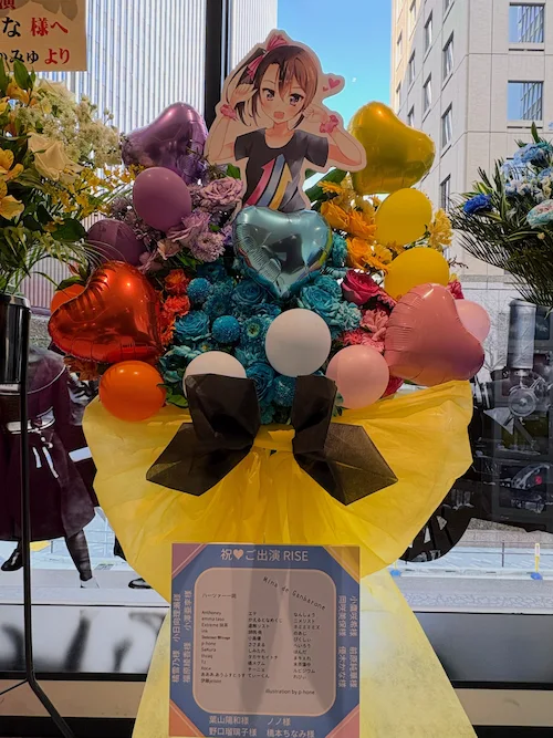 今回のLIVEの開催より少し前、フォロワーさんからLIVEにフラワースタンドを出したい、(p-honeが描いた)イラストを載せたいという話をいただき、以前描いたファンアートが載ったフラワースタンドが会場に飾られることに!