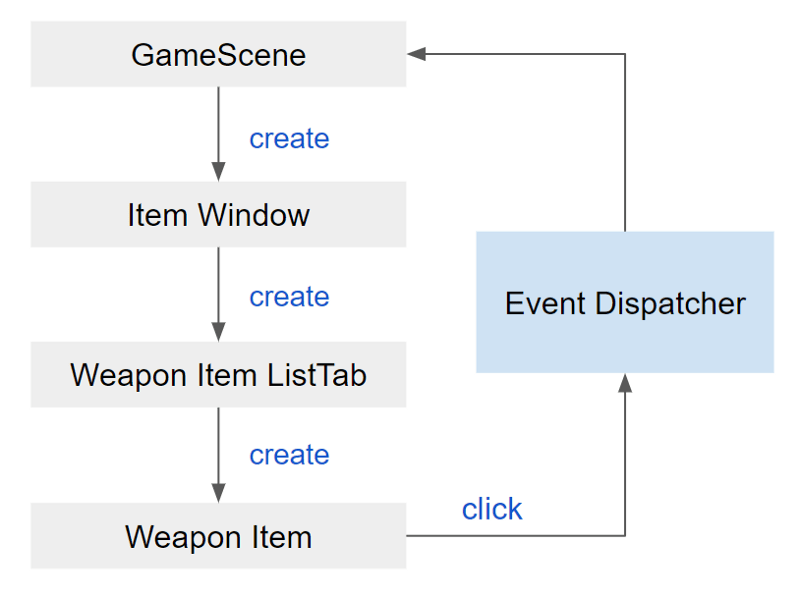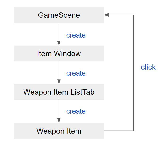 この例で難しいのは、一番下の階層 (Weapon Item) をクリックすると、一番上の階層 (Game Scene) に通知する必要があるという部分。