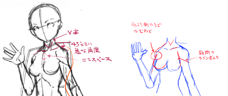 首・肩・胸・腕はつながっているので、一緒の物体として描いてしまいがちだが、筋肉のつき方的に考えると、ちゃんとブロックごとに分離している、それをわかっていると、つなぎ目あたりが不自然に見えなくなるといった感じだろうか。