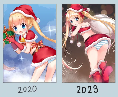 同じテーマの絵をリメイクすると自身の技術的な成長がわかって面白い。私はクリスマスの時期に同じ女の子を描いて過去の絵と比べる活動をここ数年やっている。