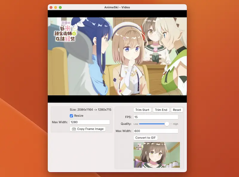 アニメーションGIFへの変換は Gifski を利用した。 画像処理技術のオタク(褒め言葉)1が作ったもので、本当にGIF?と思うほど高品質なGIFが作れる。また、変換速度も(GIF Breweryに比べて)非常に速い。