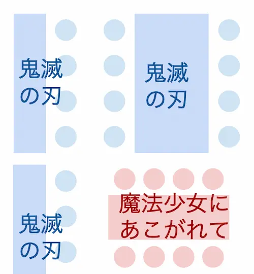 整理券を受け取り、開始時間ごろに入場。 入って席につくなり驚かされた。店内にある複数のパネルはすべて鬼滅の刃で、テレビで流れている映像も鬼滅の刃である。 本当にここであってる……よな? そして店内の座席分布は大体こんな感じだ。
