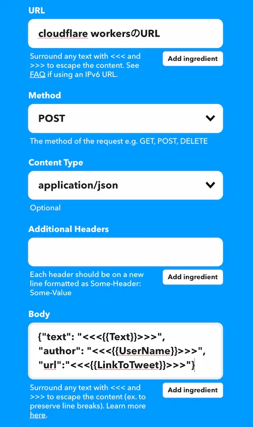 Make web requestの設定は次のようにする。 いいねした投稿の内容やURLがJSON形式でWorkersに通知される流れだ。