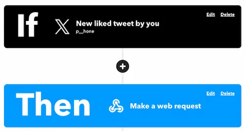 仕組みを軽く説明すると、IFTTTという「何かイベントが起きたら、他の何かに通知する」サービスを利用している。IFTTTの有料会員限定の機能1だがNew liked tweet by youトリガーを使うと、「私が投稿にいいねしたとき」に投稿URL、投稿者のID、本文などを様々な場所へ通知できる。