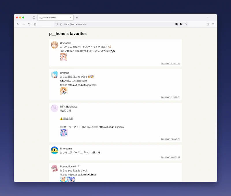 そこで、他の手段でなんとかならないかと探り私の2024/06/13からのXのいいね欄を公開したWebページを作った(※鍵アカウントの投稿は公開していない)。