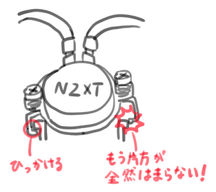 対策として、左右を固定するバネ付きのネジを片方だけつけておいて、 もう片方は下に引っ掛けてから最後にバネ付きネジをつけるという順序にしたらなんとかはまった(それでももう片方はネジの締まりが悪い感じだったが、まぁいっか…で済ました)。