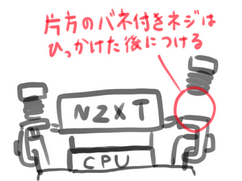 付属の説明書やネットの記事を参考に組み立てた。 だいたいスムーズに進んだが、唯一手こずったのはCPUクーラーの取り付け。 下の絵にかいたとおりCPUの上にクーラーを左右2箇所引っ掛けて固定するのだが 片方を引っ掛けるともう片方が全然はまってくれない。