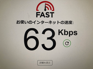 インターネットに接続したのだが、なんだかファイルのダウンロードが遅かった。 気になったのでfast.comで計測してみると…63Kbps! 90年代のインターネットかな…?