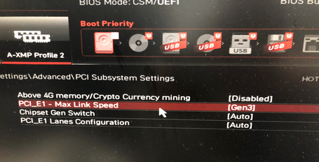 早速BIOS画面の設定画面を探してみると、PCI_E1 - Max Link Speedという項目でGen3があったので選んでみた。