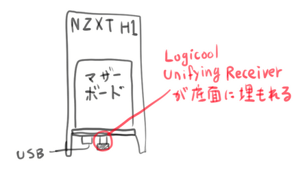 BluetoothよりもLogicool専用のUnifying Receiver接続のほうが安定してそうな印象があったので NZXT H1の底にUnifying Receiverドングルを挿し込んだ。