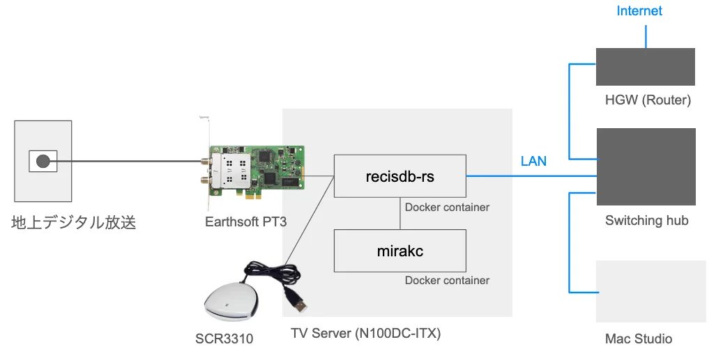 ちょうど昔買ったPT3(TVチューナー)と2017年に組んだPCのケースが余っていたのでそれを使ってTV視聴用サーバーを作ることにした。 以下のような構成となる。