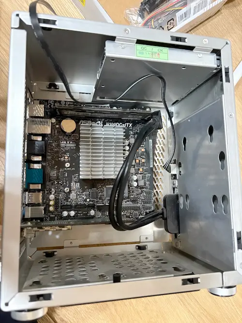 ケースにN100DC-ITXを入れたときの写真。CPUファンと電源ユニットがないのでスカスカ。