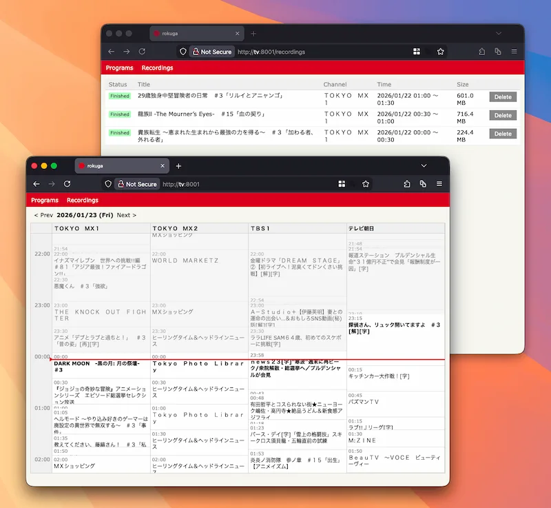 以前、PCでテレビを見る環境を作った が、録画環境はまだ整えていなかった。 Webで調べるとEDCB や EPGStation などを導入するケースが多そうだが、私が欲しいのは番組表から番組を選び、時間になったら録画してファイルに保存してくれる、という部分だけだ。その最小限だけをコンパクトに満たしたアプリが欲しくなったので自作してみた。いや、自作というよりはAIに作ってもらったと言うべきか。