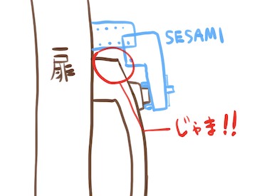 うちの扉は下のように縦長の取っ手にサムターンが付いてる形だった。しかし、取っ手が邪魔をしてSESAMI miniを扉に垂直に取り付けることができなかった。仕方ないのでSESAMIの上側のネジだけ止めて若干斜め向きのまま取り付けた。。わずかにグラグラしている…。