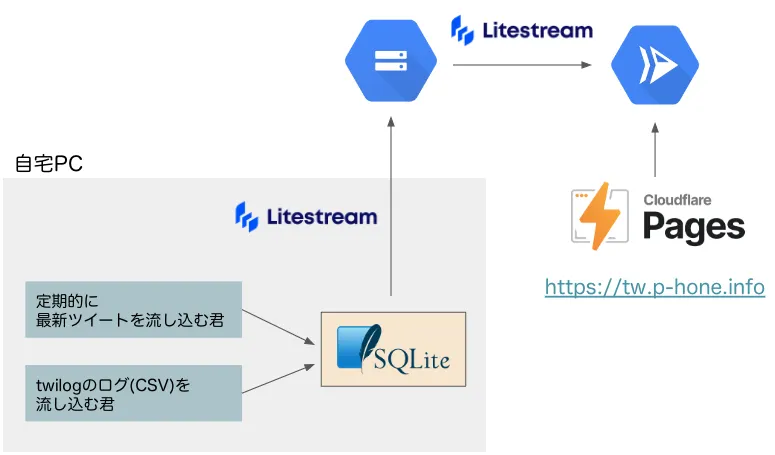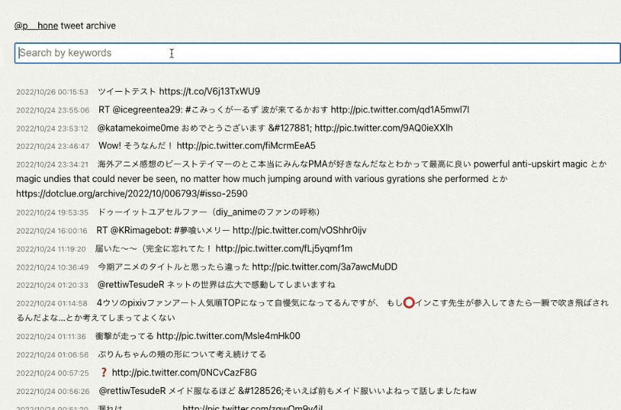 ここまでやれば手元に常に自分の全ツイートデータのバックアップが揃った状態になる。 しかし、自分のPCだけに保管するのは心もとないので、どこかサーバー上に保存しておきたくなる。さらに欲を言えばtwilogよりも素早く過去ツイートを掘り出せるようにしたい。 その発想から、過去ツイート検索Webアプリが誕生した。