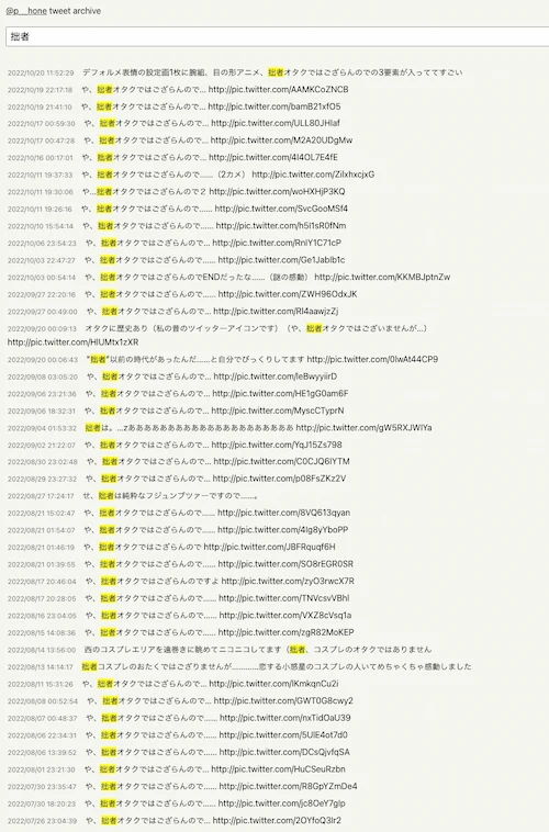 たとえば過去ツイートを「拙者」で調べたら(こいつ、どんだけ同じツイートしてるんだよ!!!)と突っ込めたりして我ながら面白さもある。