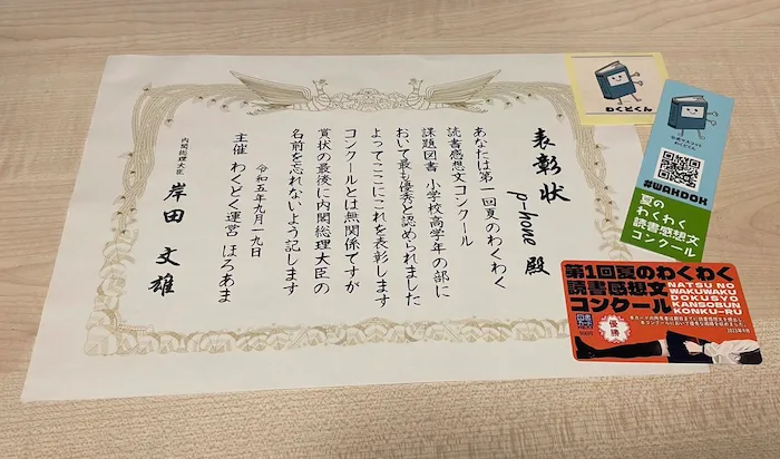 そして9月、応募作品と講評が公開された。私が送った三尺角の感想文が入賞して驚いた。さらにスゴいことに原稿用紙風に印刷された感想文、そして表彰状と図書カード、ステッカーといった賞品まで物理で届いた。