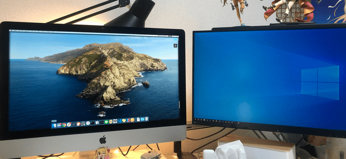 ▲この写真のように、左にMacを、右にWindowsを配置している。